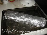 Rolat uviti dobro u aluminijumsku foliju da se ne bi razmotao tokom pečenja, staviti ga u tepsiju, naliti sa oko 1/2l vode i sa malo ulja i staviti u rernu da se peče nekih sat vremena na 200C. Za to vreme stavićete da se skuvaju pirinač i šargarepa. paprike iseći na tanje trake, a isto tako iseći i kuvanu šargarepu. Na ulje staviti da se prži paprika, dodati na trake isečenu kuvanu šargarepu i kuvani pirinač. Začiniti po ukusu.
